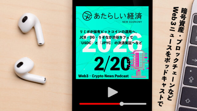 【2/20話題】リミポが保有ビットコインの運用へ、JCB・DG・りそなが渋谷カフェで「USDC」と「JPYC」の決済実証へなど(音声ニュース)