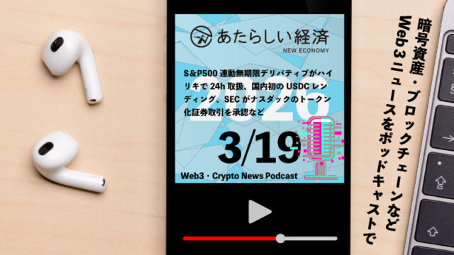 【3/19話題】S&P500連動無期限デリバティブがハイリキで24h取扱、国内初のUSDCレンディング、SECがナスダックのトークン化証券取引を承認など(音声ニュース)