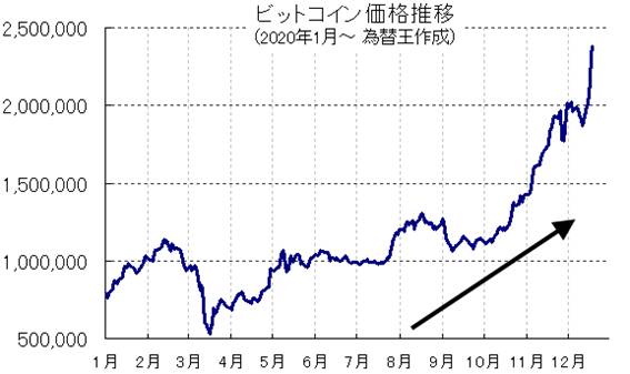 ビットコインが新たな価格上昇トレンドに入っています。2017年暮れの“仮想通貨バブル”の最高値をあっさり上回り、ぐいぐい値上がりしています。(今年3月の安値約50万円→ 先週の最高値245万円)。参照元:為替王