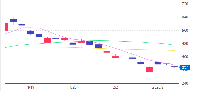 市場データでも、2026年1月中旬には株価が500円台で推移する日があった一方、2月に入ってからは300円台前半〜中盤の水準で推移する日が多いなど、1月との比較でやや下振れ方向で推移していることが確認されています。