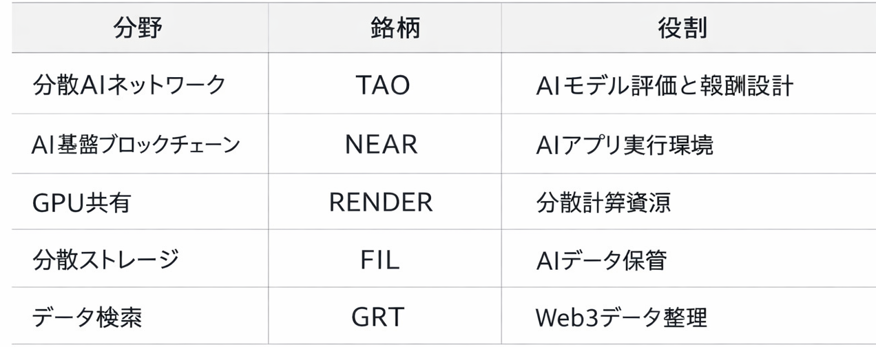 これらはAIとブロックチェーンの融合領域において、基盤的役割を担うプロジェクトとして評価されています。