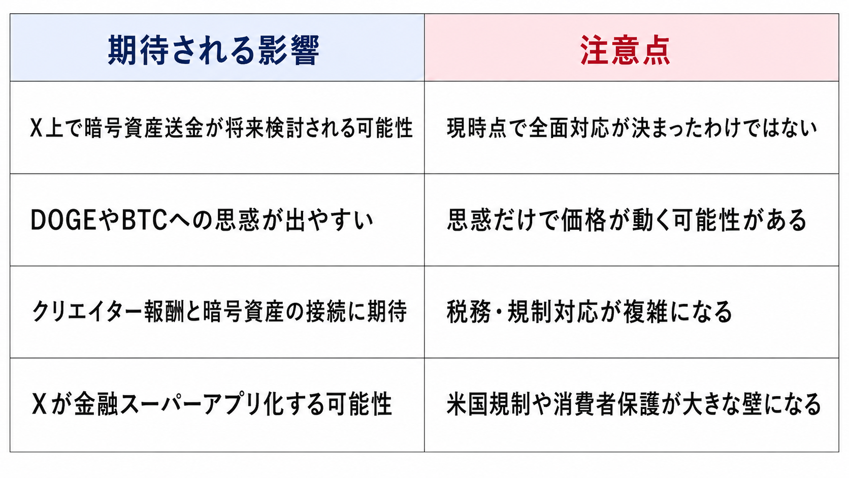 つまり、X Moneyは暗号資産にとって重要な周辺ニュースですが、短期的に「DOGEやBTCが必ず上がる」と見るのは危険です。