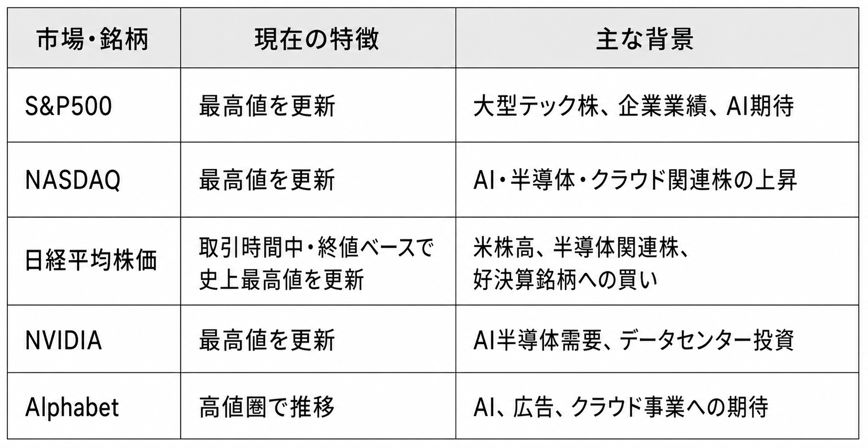 株式市場では、S&P500、NASDAQ、日経平均、NVIDIA、Alphabetが高値圏を更新しています。