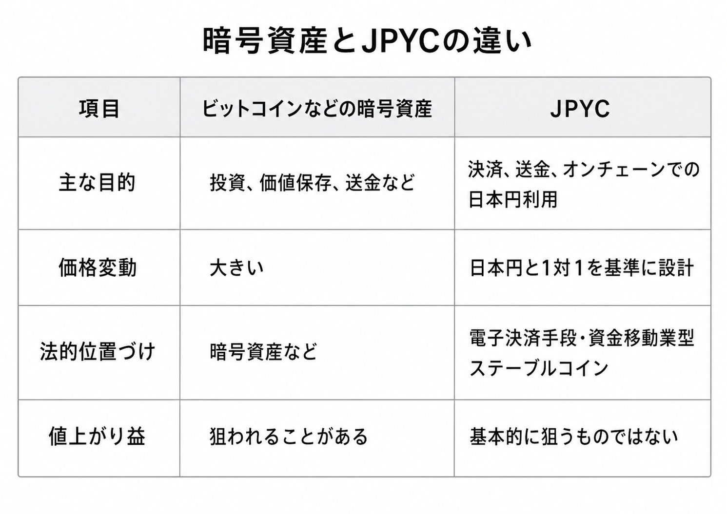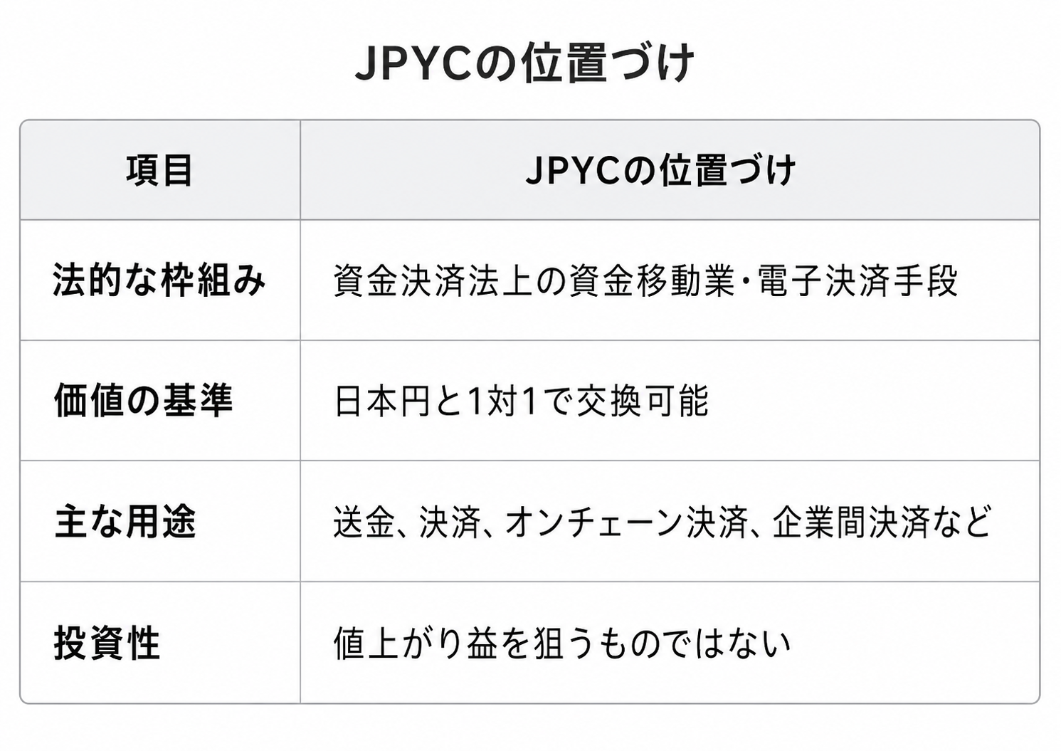 これは、JPYCがビットコインやイーサリアムのような投資対象としての暗号資産ではなく、資金決済法上の資金移動業・電子決済手段の枠組みで整理される日本円建てステーブルコインであることを示しています。