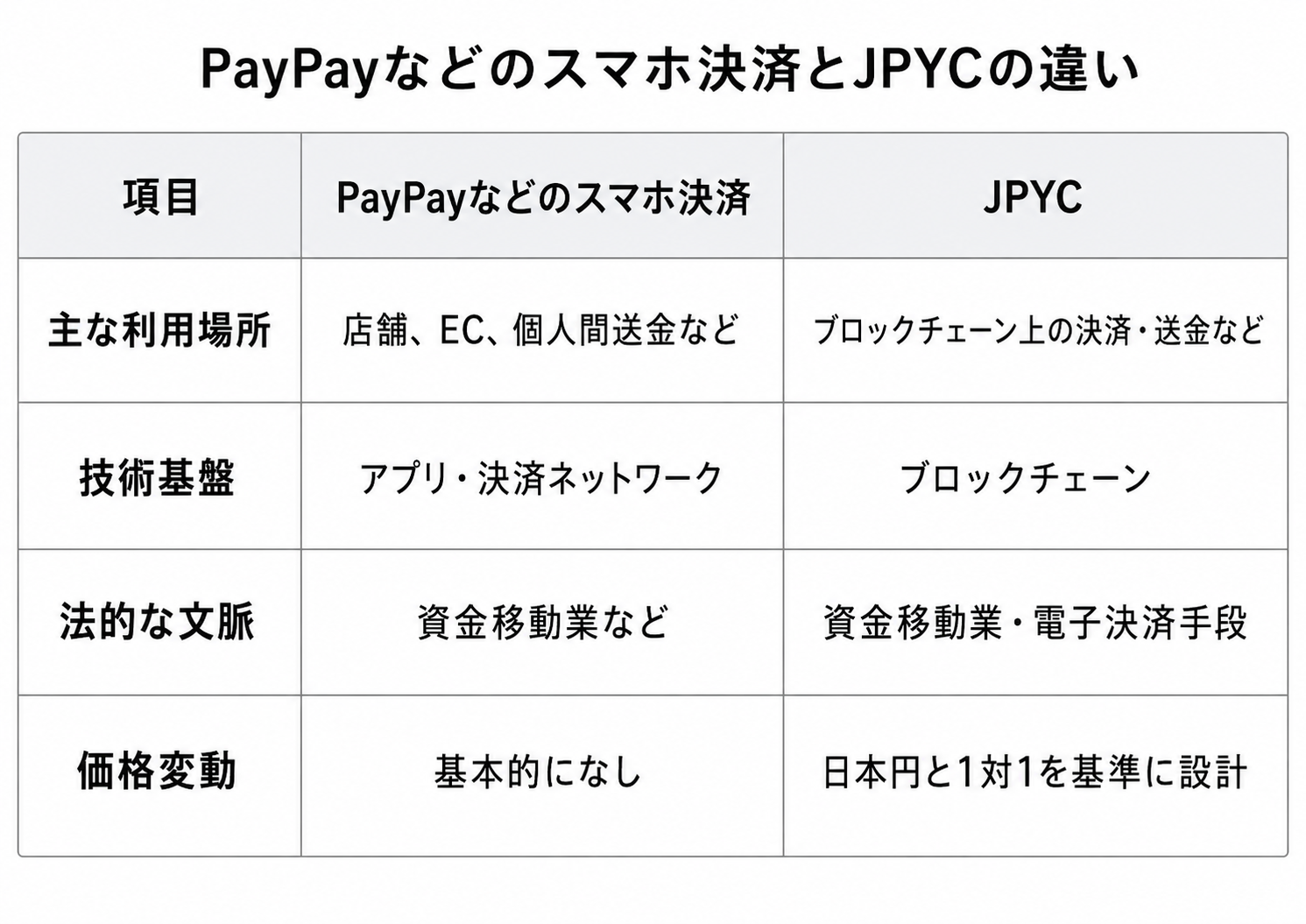 PayPayはスマホ決済サービスであり、JPYCはブロックチェーン上で発行・流通する日本円ステーブルコインです。