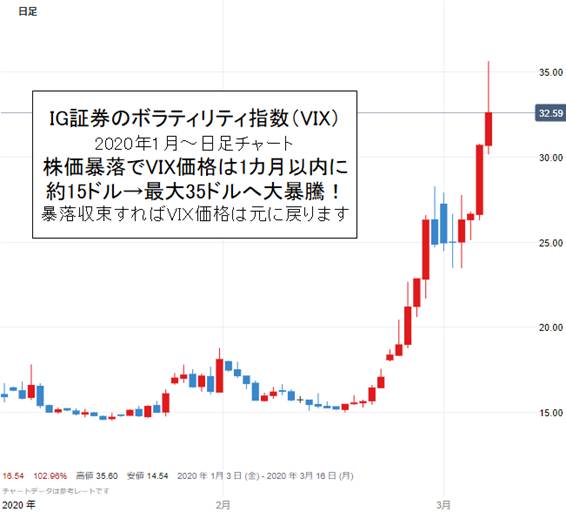 ボラティリティ指数(VIX)=別名「恐怖指数」、コロナショックで大暴騰!IG証券口座で買いも売りも取引できます! 【Q】 ボラティリティ指数(VIX)、別名「恐怖指数」って何ですか? 【A】 ボラティリティとは日本語で“相場変動の激しさ”のこと。それを指数化した金融商品が「ボラティリティ指数(VIX)」。 狙い方は2通り。 「株価が暴落し変動が激しくなる→ VIX価格は急騰する→ ... X Facebook はてブ Pocket LINE コピー 2020.03.09 【Q】 ボラティリティ指数(VIX)、別名「恐怖指数」って何ですか? 【A】 ボラティリティとは日本語で“相場変動の激しさ”のこと。それを指数化した金融商品が「ボラティリティ指数(VIX)」。 狙い方は2通り。 「株価が暴落し変動が激しくなる→ VIX価格は急騰する→ 買いで儲けるチャンス」 「株価の暴落・相場変動が収まる→ VIX価格は急反落する→ 売りで儲けるチャンス」 続きを読む 参照元:為替王
