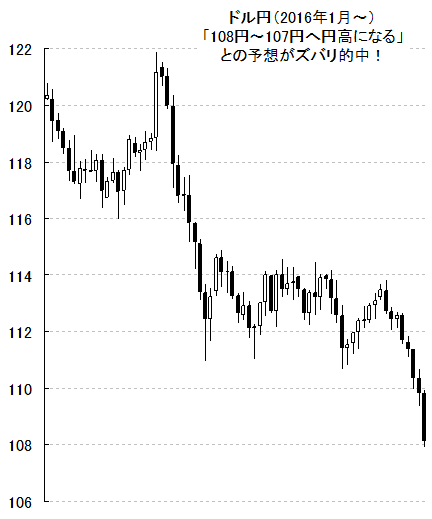 【緊急解説】投資マニュアル・秘伝チャートを使って、113円台→108円~107円への円高予測ズバリ的中。中短期的な下値メドと今後の見通しについて ●「2016年は円高になる可能性が高い」 ●「110円割れは時間の問題」 ●「4月の円高メドはずばり1ドル=108円~107円台あたり」 当ブログではこのように、ずっと円高になると予想し続けてきました。 鮮やかに予想的中しました。 読者の皆様、おめでとうございました。 X Facebook はてブ Pocket LINE コピー 2016.04.08 ●「2016年は円高になる可能性が高い」 ●「110円割れは時間の問題」 ●「4月の円高メドはずばり1ドル=108円~107円台あたり」 当ブログではこのように、ずっと円高になると予想し続けてきました。 鮮やかに予想的中しました。 読者の皆様、おめでとうございました。 続きを読む 参照元:為替王