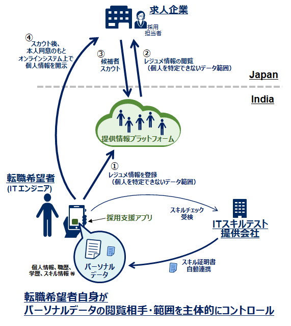 この実証実験ではまず転職希望者であるインド在住のITエンジニアが現地で事前にオンラインによるITスキルテストを行い、その結果をスマートフォンアプリに自動連携することで転職希望者は自らのスキル証明書を信頼性の高い情報として保管ができる。この証明書は転職希望者がアクセス許可した企業が閲覧できるため、企業ごとに異なるスキルチェックテストを受ける手間が省け、転職希望者の選択肢の幅を広げることに繋がるとのこと。また求人企業はそれらの情報によって、採用後の人材ミスマッチを防ぐことが期待できるとのこと。
