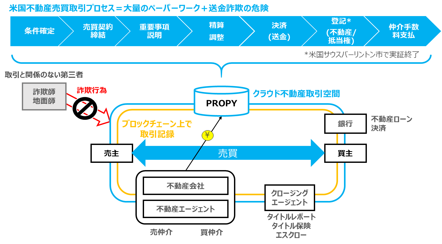 プレスリリースによるとプロピー社の不動産取引プラットフォームを活用することで、不動産仲介企業やエージェントと呼ばれる個人仲介事業者は、不動産取引における当事者のみがアクセスできるクラウドの取引空間上で、取引にかかる全てのプロセスを完結できるとのことです。また部外者は取引空間に介入できないため、電子送金詐欺等の不正被害を防ぐことが可能であるとのことです。さらにこのプラットフォームでは、取引のプロセス上必要となる当事者間の書類確認や署名はブロックチェーン上で行われるため、改ざん耐性の高い状態で保存・管理されるとのことです。