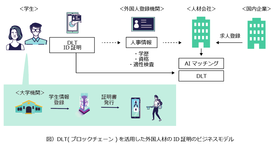 EdMuse株式会社はDLT・ブロックチェーンを用いて、人々のアイデンティティである個人情報や学歴証明、技能評価試験結果などを含めた、人材のID証明に取り組んでいる企業である。EdMuseは既にベトナム・インドネシア・インドなどの諸外国における教育機関と協働で、外国人材のID証明の実証実験を行っている。