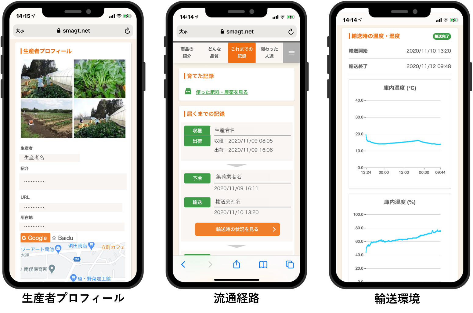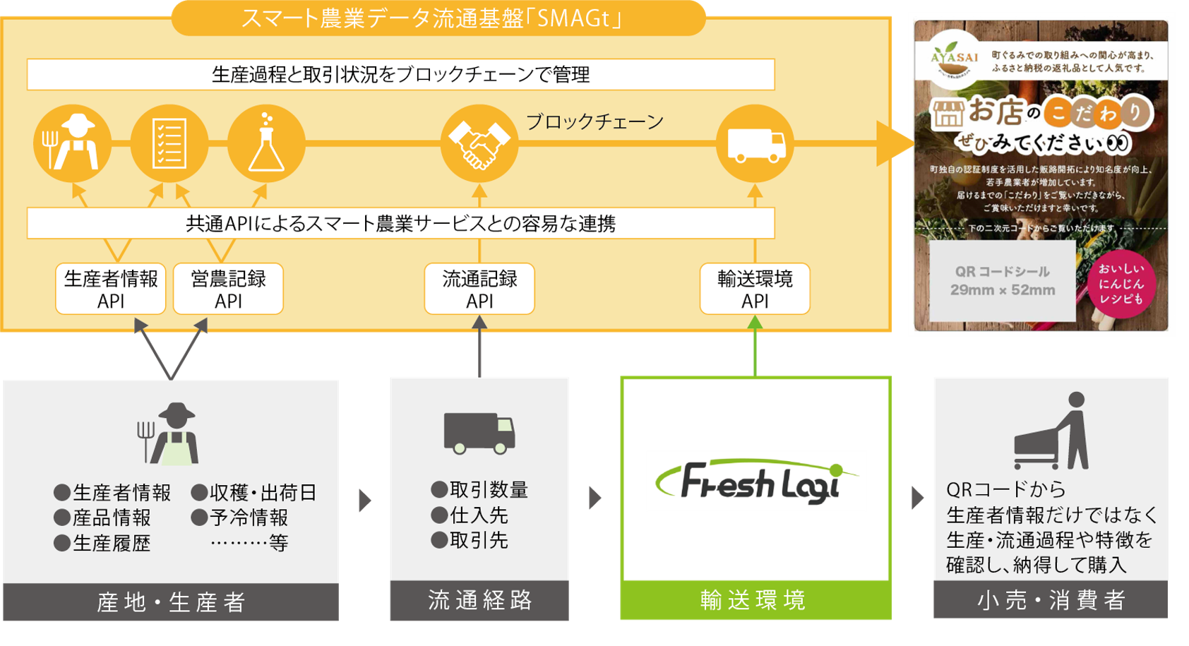 システム」でセンシングする輸送環境データを「SMAGt」に自動連携する仕組みを開発したとのこと。商品に張り付けられたQRコードを読み取るだけで「SMAGt」が管理する産地・農産品のトレーサビリティや、流通・物流における経路情報に加え、「Fresh Logi