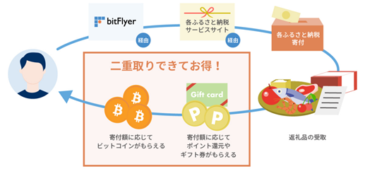 またビットフライヤーによると「ビットコインをもらう」サービスをふるさと納税にて利用することで、ポイントとビットコインを「二重取り」できるとのことです。