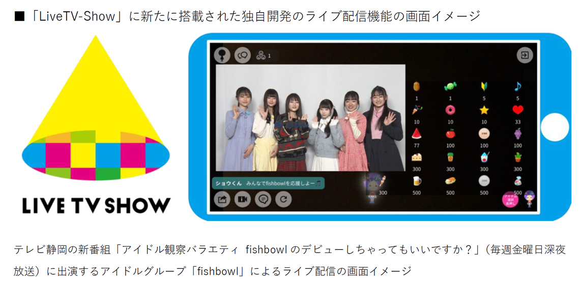 そして今回、株式会社テレビ静岡で2021年1月から放送している新番組に出演するアイドルグループ「fishbowl(フィッシュボウル)」のファン向けに、このライブ配信機能を搭載したLiveTV-Showの提供開始も発表された。
