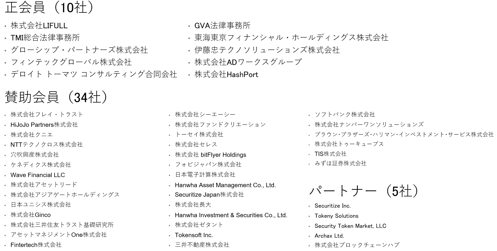 JSTAでは現在正会員10社、賛助会員34社が参画しています。その他パートナーとしてSecuritize Inc.(米国)、Tokeny(ルクセンブルク)、Security Token Market, LLC(米国)、株式会社ブロックチェーンハブ、そしてアーチャックスの5社がJSTAと提携をしています。