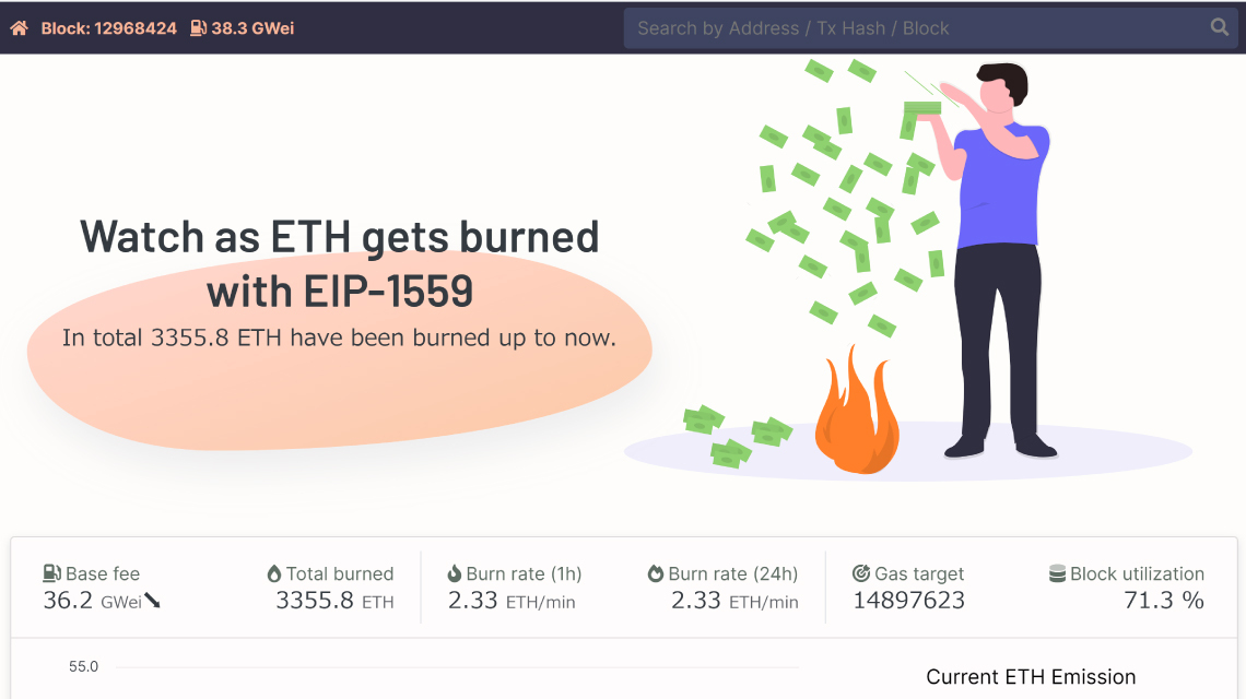 このバーンの対象となるETHはアップグレード後約14時間(記事執筆時点8月6日11:00時点)で3,300ETHを越えており、およそ1分あたり2.33ETH(約73万円)のペースでバーンが行われている。