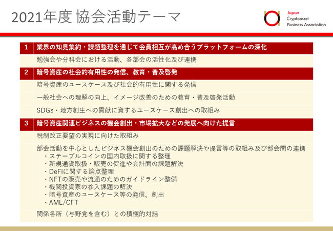 その重点テーマとして「業界の知見集約・課題整理を通じて会員相互が高め合うプラットフォームの深化」、「暗号資産の社会的有用性の発信」、「教育・普及啓発、暗号資産関連ビジネスの機会創出・市場拡大などの発展へ向けた提言」の3つが挙げられている。