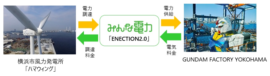 発表によると横浜市風力発電所「ハマウィング」で発電した電力が「GUNDAM FACTORY YOKOHAMA」へ供給される。ブロックチェーン技術を活用したP2P電力トラッキングシステムにより、「ハマウィング」の発電量と供給先の需要量を30分ごとにマッチングさせることで発電所を特定した電力供給が実現しているとのこと。