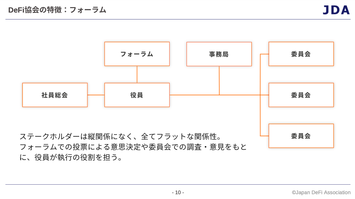なお協会の特徴として限りなく分散型組織を目指すとのことで、参考としてイーサリアムとイーサリアム財団の関係性などが挙げられた。そして「ステークホルダーは縦関係になく、全てフラットな関係性。フォーラムでの投票による意思決定や委員会での調査・意⾒をもとに、役員が執⾏の役割を担う」と説明された。