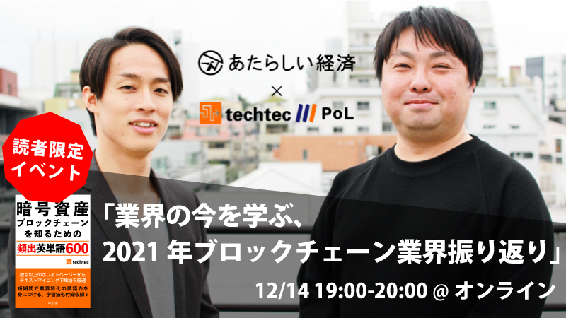 また本書の発売を記念し、購入者限定のウェビナー「業界の今を学ぶ、2021年ブロックチェーン業界振り返り」を開催を開催します。ウェビナーではtechtec代表取締役の田上智裕と幻冬舎「あたらしい経済」編集長の設楽悠介が、今年1年の業界動向を振り返ります。