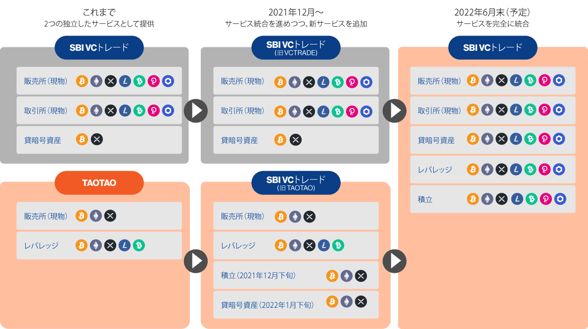 また今回の発表で「SBI VCトレード株式会社(新)」は「2022年6月を目途として当該2モデルの統合を行うことも計画しております」と両取引所のサービス統合予定を明らかにした。統合にあたり、旧TAOTAOの口座を基軸とするようだ。