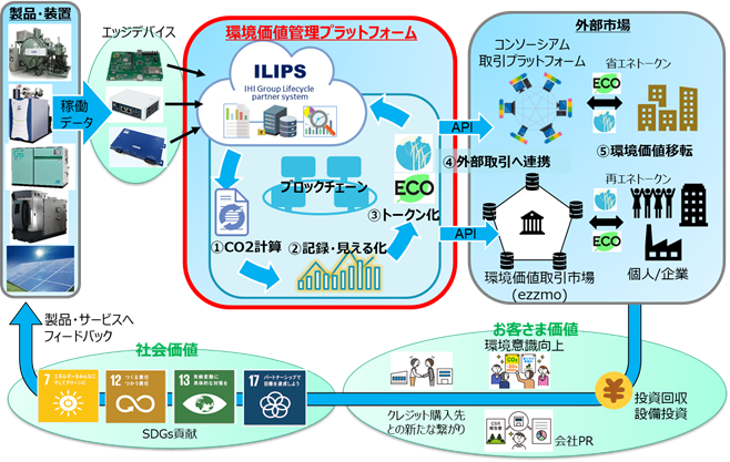 今回IHIが発表した「環境価値管理プラットフォーム」は、「ILIPS」のクラウド上に蓄積された稼働データより算出したCO2の排出量と削減量を記録・見える化し、環境価値に変換して外部市場に流通させる仕組みとのこと。