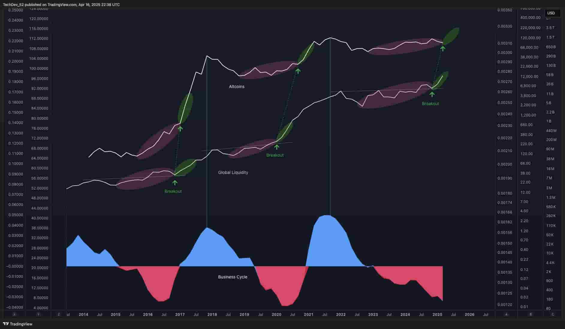 TechDev氏によれば、世界中の市場資金が急激に増え、景気循環(ビジネスサイクル)が底を打つ時期には、過去にもアルトコイン市場が大きく上昇する「アルトシーズン」が起きやすい傾向があります。