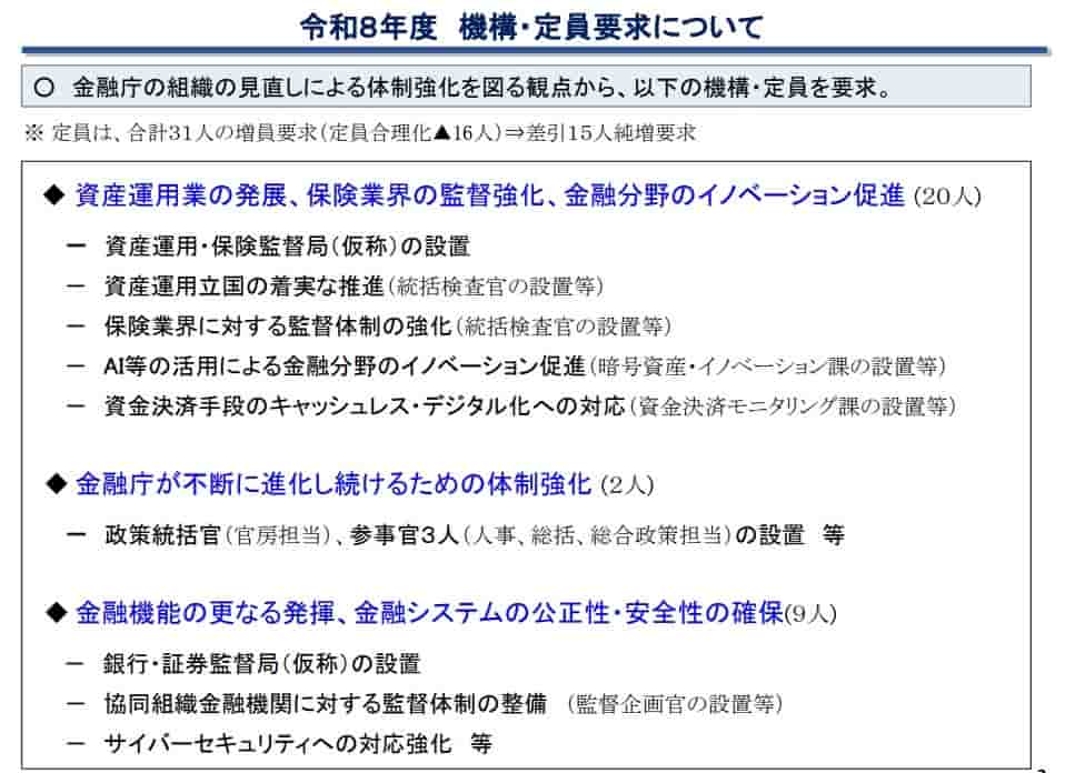 暗号資産やブロックチェーン、フィンテック、生成AIといったデジタル技術に対応する体制強化を目的としており、資金決済を監視する「資金決済モニタリング課」の設置も計画されています。