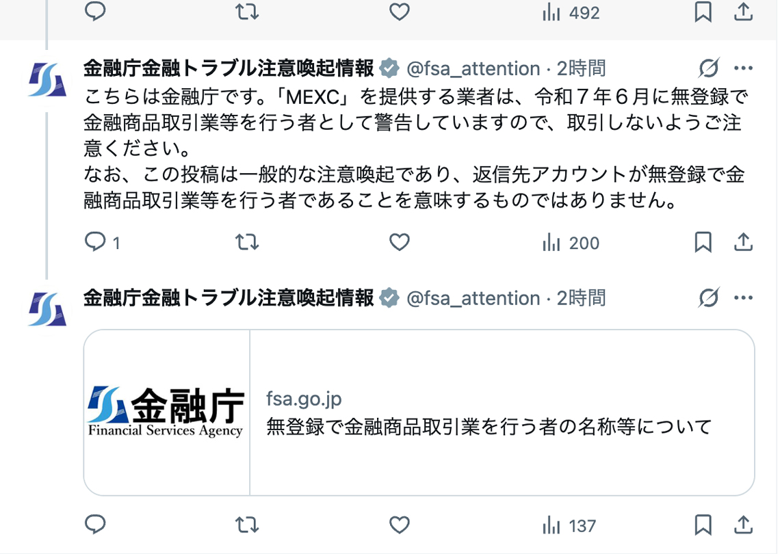 「あたらしい経済」編集部が確認したところ金融庁金融トラブル注意喚起情報アカウントは、「Money Charger」、「MIDORI FX」、「LBank」、「MEXC」、「Bitget」といった取引所の新規登録やキャンペーン参加を促すXアカウントに対して取引をしないようリプライで注意喚起している。