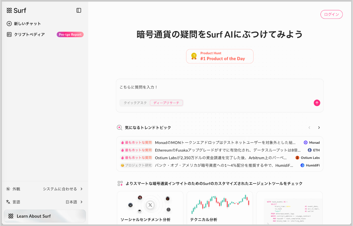 「Surf」は、シンプルなチャットインターフェースを通じて正確で信頼できるインサイトを提供する、デジタル資産向けのAIインテリジェンスプラットフォームだ。独自データとドメイン特化型モデルを用いて、機関投資家および個人投資家がプロジェクトを分析し、市場状況を理解し、自信を持って意思決定できるよう支援している。