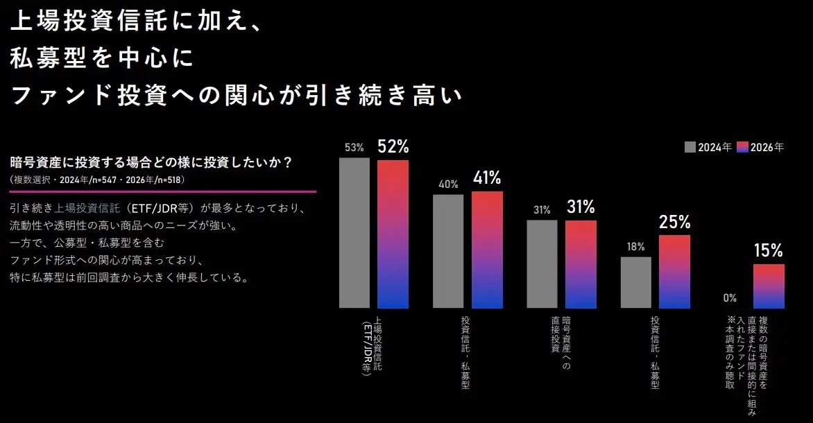 暗号資産への投資手法としては「上場投資信託(ETF/JDR等)」が53%で最多となり、流動性と透明性の高い商品へのニーズが引き続き強い結果となっています。