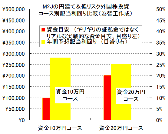 冬のボーナス10万円を使って、毎週高配当を円でもらい、年間配当利回り28%を達成する、M2J社の完全円建て&極めて低リスクな外国株価指数投資の方法教えます。 M2Jの高配当の外国株投資(為替リスクなし)、 冬のボーナス50万円で始める方法をご紹介しましたが、 本日は、もっと少額から高配当利回りが狙えるコース。 【資金10万円コース】 ⇒ 毎週配当、為替リスクゼロで年間配当利回り28%! 【資金20万円コース】 ⇒ 配当は3日... X Facebook はてブ Pocket LINE コピー 2016.11.30 M2Jの高配当の外国株投資(為替リスクなし)、 冬のボーナス50万円で始める方法をご紹介しましたが、 本日は、もっと少額から高配当利回りが狙えるコース。 【資金10万円コース】 ⇒ 毎週配当、為替リスクゼロで年間配当利回り28%! 【資金20万円コース】 ⇒ 配当は3日に1回、為替リスクゼロで年間配当利回り25%! 続きを読む 参照元:為替王