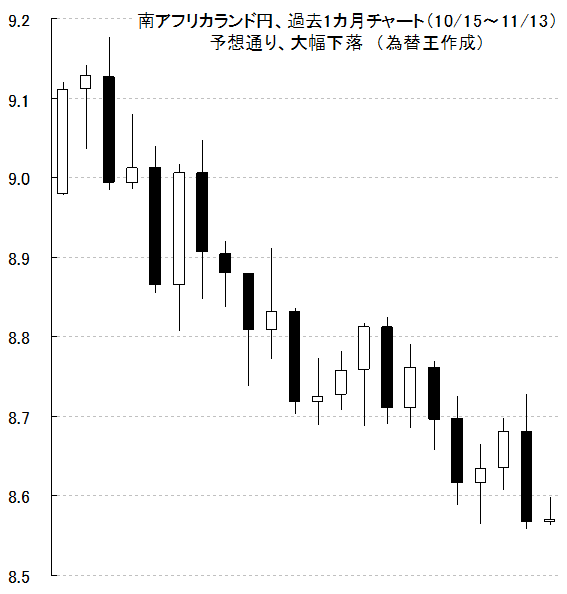 南アフリカランド年初来安値接近!下落予想ズバリ的中、2週間で証拠金1.7倍増! 今後の見通しは?どこまで下落? 南アフリカランド円について、当ブログでは先月から 「注視すべき状況」「重要な下値サポート帯を割り込んできた」などと警戒し、 具体的には「8.5円近くがとりあえずの目処」と明言。 南アランドを保有中の方も多いので、心苦しいのですが、 予想が的中してしまい、今... X Facebook はてブ Pocket LINE コピー 2015.11.14 南アフリカランド円について、当ブログでは先月から 「注視すべき状況」「重要な下値サポート帯を割り込んできた」などと警戒し、 具体的には「8.5円近くがとりあえずの目処」と明言。 南アランドを保有中の方も多いので、心苦しいのですが、 予想が的中してしまい、今週1ランド=8.5円まで下落してきました。 続きを読む 参照元:為替王