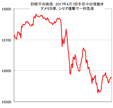 【シリア問題まとめ】アメリカがシリアに空爆開始で、日経平均も為替も急落。今後も、シリアの問題は長期化する見通し。アメリカとロシアの対立も激化。株安・円高要因に。 日経平均株価が昨日、200円以上も急落 (1万8700円台→1万8500円台)する場面がありました。 原因は、アメリカ軍によるシリアへの爆撃。 X Facebook はてブ Pocket LINE コピー 2017.04.08 日経平均株価が昨日、200円以上も急落 (1万8700円台→1万8500円台)する場面がありました。 原因は、アメリカ軍によるシリアへの爆撃。 続きを読む 参照元:為替王