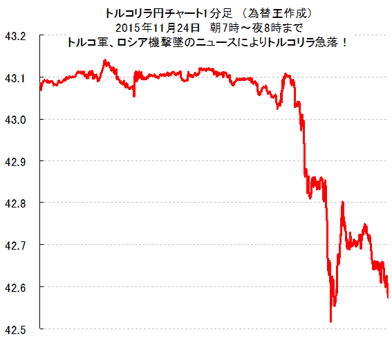 【緊急解説】トルコ軍、ロシア機撃墜で、トルコリラ急落!今後、更なるトルコリラ暴落の可能性は? トルコ軍が、ロシア軍の戦闘機を撃墜。 この突然のニュースが流れた昨夜、 為替市場ではトルコリラが、 株式市場ではトルコ株が急落しました。 X Facebook はてブ Pocket LINE コピー 2015.11.25 トルコ軍が、ロシア軍の戦闘機を撃墜。 この突然のニュースが流れた昨夜、 為替市場ではトルコリラが、 株式市場ではトルコ株が急落しました。 続きを読む 参照元:為替王