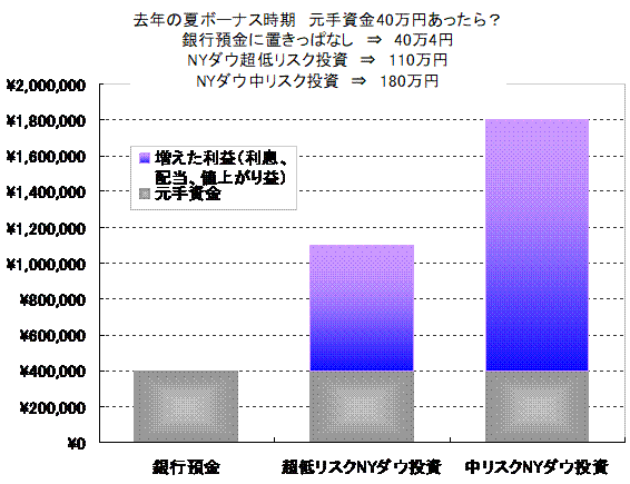 40万で去年夏のボーナス時期に円建てNYダウ投資を試しに始めた人と、銀行預金に置きっぱなしだった人と、どれくらい差額が出ていますか? 去年の夏のボーナス時期、元手資金40万円。。。 銀行預金に置きっぱなしの人 40万円⇒ 現在40万4円 (←意味なし) 円建てNYダウ超低リスク投資 40万円⇒ 現在110万円 (←おすすめ) 円建てNYダウ中リスク投資 40万円⇒ 現在180万円 (←普通) 円建てNYダウ高... X Facebook はてブ Pocket LINE コピー 2017.11.06 去年の夏のボーナス時期、元手資金40万円。。。 銀行預金に置きっぱなしの人 40万円⇒ 現在40万4円 (←意味なし) 円建てNYダウ超低リスク投資 40万円⇒ 現在110万円 (←おすすめ) 円建てNYダウ中リスク投資 40万円⇒ 現在180万円 (←普通) 円建てNYダウ高リスク投資 40万円⇒ 現在1,090万円 (←NG) 続きを読む 参照元:為替王