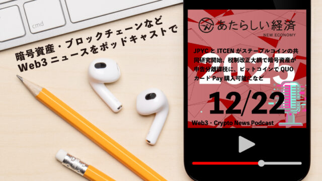 【12/22話題】JPYCとITCENがステーブルコインの共同研究開始、税制改正大綱で暗号資産が申告分離課税に、ビットコインでQUOカードPay購入可能になど(音声ニュース) Web3ニュースをポッドキャストで! ブロックチェーン・仮想通貨(暗号資産)・フィンテックについてのニュース解説を「あたらしい経済」編集部が、平日毎日ポッドキャストでお届けします。Apple Podcast、Spotif […] 2025.12.22