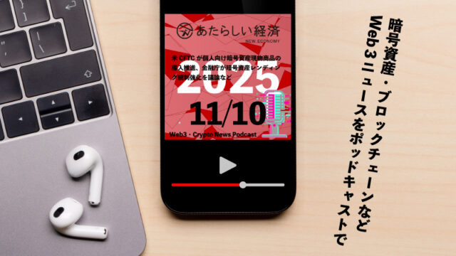 【11/18話題】JPYCとDPが地方金融機関の業務連携を共同検討、IG証券が暗号資産ETFのCFD取引提供終了、ストラテジーがBTC追加購入など(音声ニュース) Web3ニュースをポッドキャストで! ブロックチェーン・仮想通貨(暗号資産)・フィンテックについてのニュース解説を「あたらしい経済」編集部が、平日毎日ポッドキャストでお届けします。Apple Podcast、Spotif […] 2025.11.18