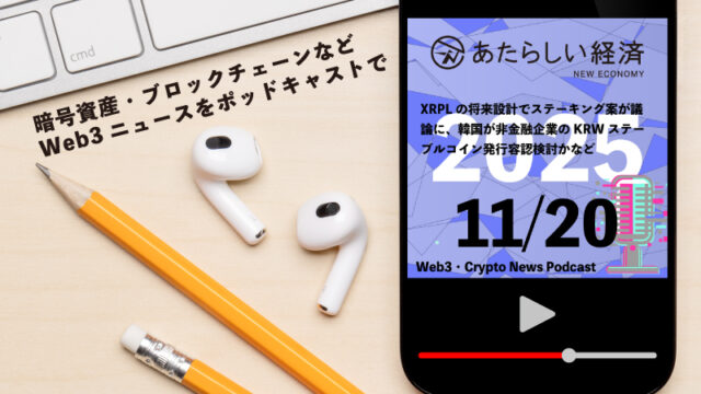 【11/20話題】XRPLの将来設計でステーキング案が議論に、韓国が非金融企業のKRWステーブルコイン発行容認検討かなど(音声ニュース) Web3ニュースをポッドキャストで! ブロックチェーン・仮想通貨(暗号資産)・フィンテックについてのニュース解説を「あたらしい経済」編集部が、平日毎日ポッドキャストでお届けします。Apple Podcast、Spotif […] 2025.11.20