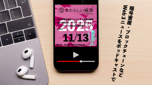 【11/13話題】JPXが暗号資産トレジャリー企業の規制強化を検討か、ポリマーケットがヤフーファイナンスの独占予測市場パートナーになど(音声ニュース) Web3ニュースをポッドキャストで! ブロックチェーン・仮想通貨(暗号資産)・フィンテックについてのニュース解説を「あたらしい経済」編集部が、平日毎日ポッドキャストでお届けします。Apple Podcast、Spotif […] 2025.11.13