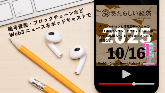 【10/16話題】AIフュージョンと博報堂キースリーのDAT事業コンサル、モブキャストが5億円でSOL購入へ、EFがモルフォでETH運用など(音声ニュース) Web3ニュースをポッドキャストで! ブロックチェーン・仮想通貨(暗号資産)・フィンテックについてのニュース解説を「あたらしい経済」編集部が、平日毎日ポッドキャストでお届けします。Apple Podcast、Spotif […] 2025.10.16