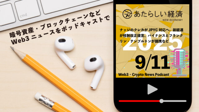 【9/11話題】ナッジのクレカがJPYC対応へ、新経連が税制改正提言、バイナンスとフランクリン・テンプルトンが提携など(音声ニュース) Web3ニュースをポッドキャストで! ブロックチェーン・仮想通貨(暗号資産)・フィンテックについてのニュース解説を「あたらしい経済」編集部が、平日毎日ポッドキャストでお届けします。Apple Podcast、Spotif […] 2025.09.11