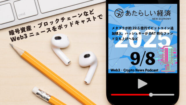 【9/8話題】メタプラが約22.5億円でビットコイン追加購入、ハッシュキーがDAT特化ファンド立ち上げへなど(音声ニュース) Web3ニュースをポッドキャストで! ブロックチェーン・仮想通貨(暗号資産)・フィンテックについてのニュース解説を「あたらしい経済」編集部が、平日毎日ポッドキャストでお届けします。Apple Podcast、Spotif […] 2025.09.08
