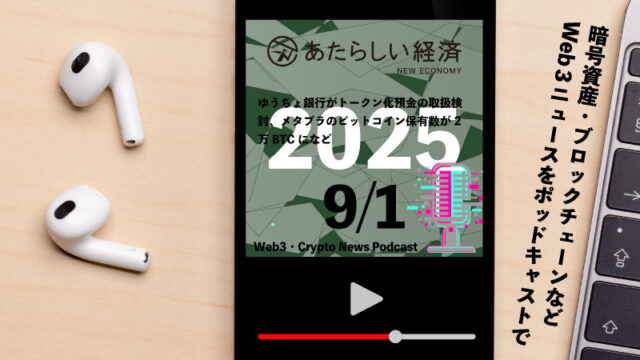 【9/1話題】ゆうちょ銀行がトークン化預金の取扱検討、メタプラのビットコイン保有数が2万BTCになど(音声ニュース) Web3ニュースをポッドキャストで! ブロックチェーン・仮想通貨(暗号資産)・フィンテックについてのニュース解説を「あたらしい経済」編集部が、平日毎日ポッドキャストでお届けします。Apple Podcast、Spotif […] 2025.09.01
